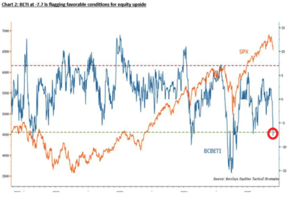 Le graphique montre l’évolution du BETI (Barclays Equities Timing Indicator) en bleu et du S&P 500 en orange.