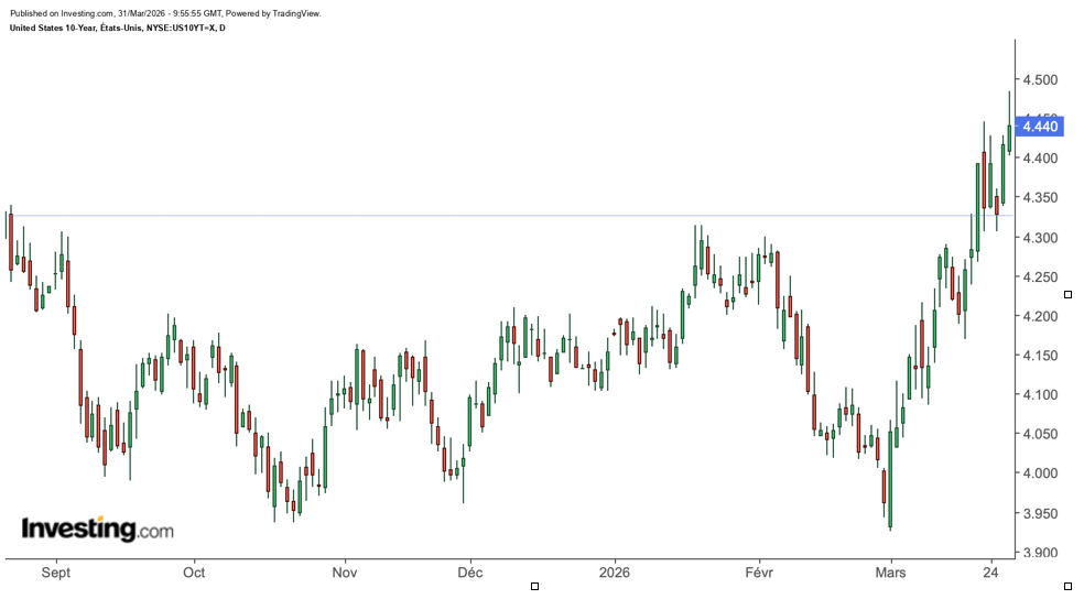 Tant que le 10 ans reste en deçà de 4,50%, on demeure dans une zone de tension élevée mais gérée. Si ce seuil venait à être franchi de façon durable, la probabilité d'un geste politique augmenterait de façon notable — annonce diplomatique sur le conflit iranien, initiative de la Fed, déclaration du Trésor. Cela crée un plancher implicite sur la dégradation, mais certainement pas une garantie de stabilité des marchés actions.