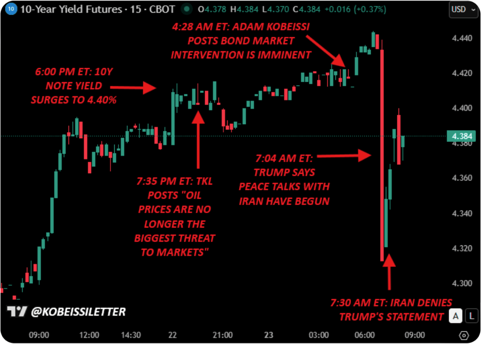 Le graphique 3 documente minute par minute la nuit du 22 au 23 mars 2026. Le rendement approche les 4,45%, Trump annonce des pourparlers de paix avec l'Iran — les taux rechutent immédiatement de 50 points de base en quelques heures. L'Iran démentira dans la foulée, créant une volatilité extrême mais révélatrice.