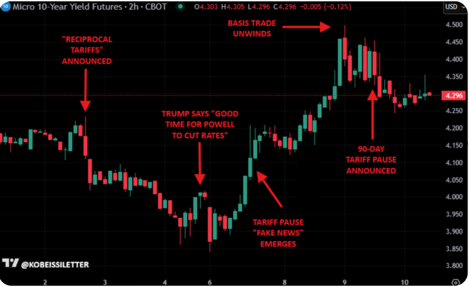 L'idée n'a rien de spéculatif elle est documentée et assumée. Le 10 avril 2025, en pleine crise tarifaire, Trump a déclaré publiquement dans une interview en direct qu'il "regardait le marché obligataire". Quelques heures plus tard, la pause de 90 jours était annoncée. Le rendement 10 ans venait précisément de toucher 4,50%. La séquence est trop précise pour être une coïncidence.