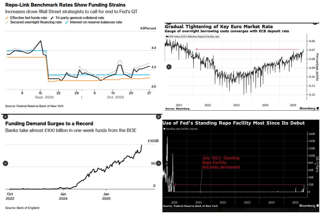 Ces quatre graphiques, issus de la Fed, de la BCE et de la Banque d’Angleterre, dressent un constat commun : la liquidité interbancaire mondiale se tend à nouveau, malgré des taux directeurs stables ou en baisse.